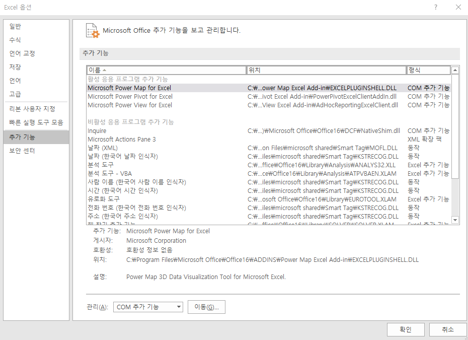 두번째는 엑셀 COM 추가 기능 해제, 파일 > 옵션 > 추가 기능 탭에서 우측 하단 관리 콤보 박스를 COM 추가 기능으로 바꾸고 이동 버튼을 누른다COM 추가 기능에서 체크를 모두 빼고 확인 버튼을 누른다